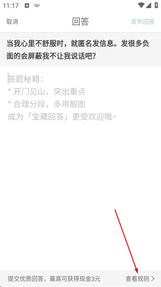 2、進(jìn)入回答編輯頁面后,點(diǎn)擊查看規(guī)則。