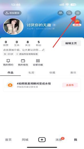 2、進入個人主頁,點擊個人主頁右上角的三橫線圖標。