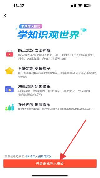 4、點擊開啟未成年人模式,該模式會限制使用時長、過濾不適宜未成年人的內(nèi)容,助力營造健康網(wǎng)絡環(huán)境。