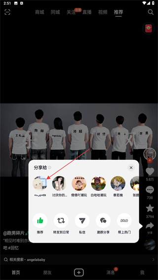 2、在下方彈出的分享界面內(nèi),選擇并點擊要分享的目標人物。