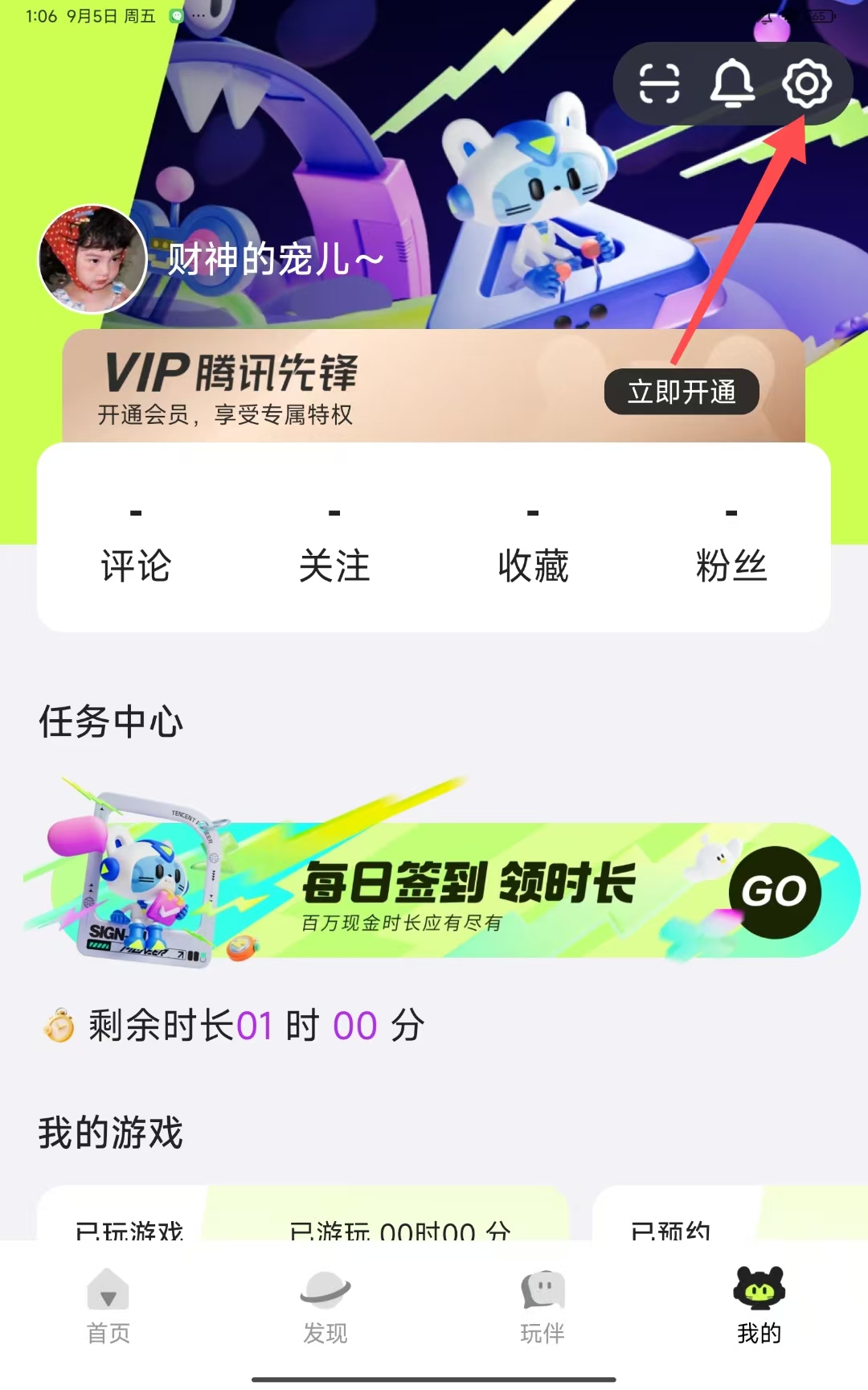2、進入我的頁面后,點擊右上角的設置齒輪圖標。