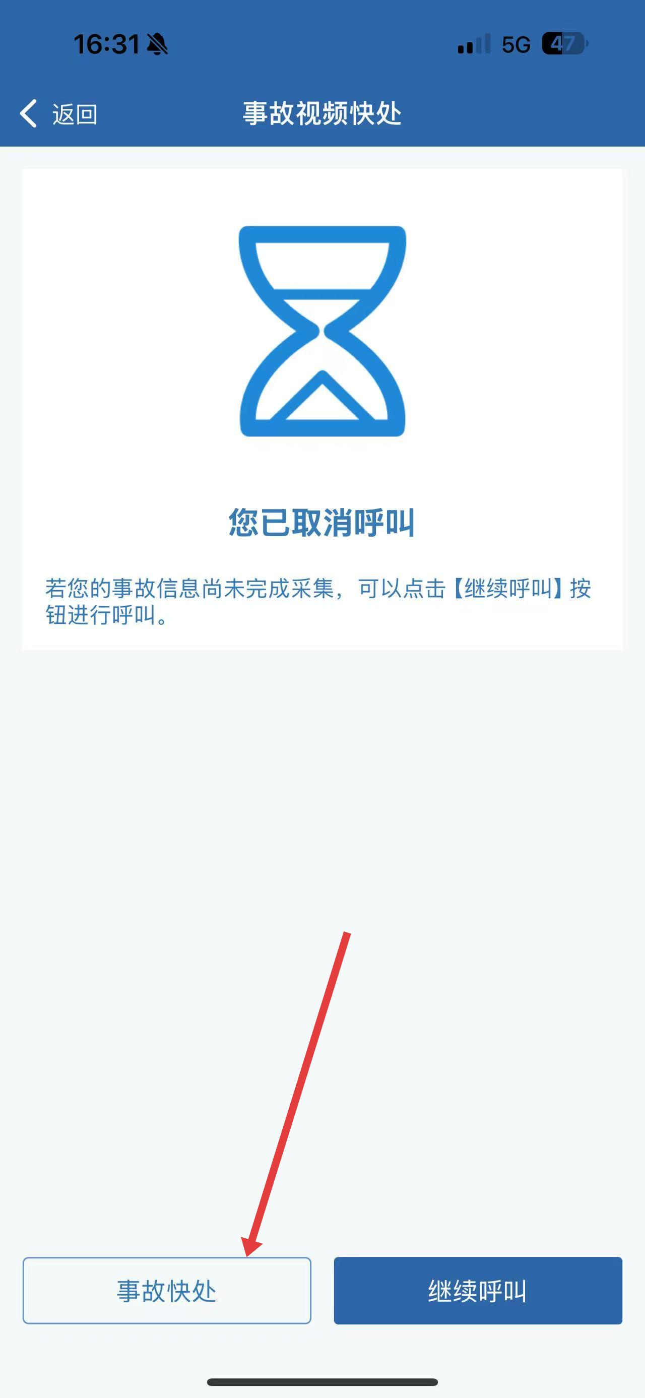 3、若取消呼叫,需要繼續(xù)處理事故,可點(diǎn)擊事故快處按鈕,按后續(xù)指引完成事故快處流程。