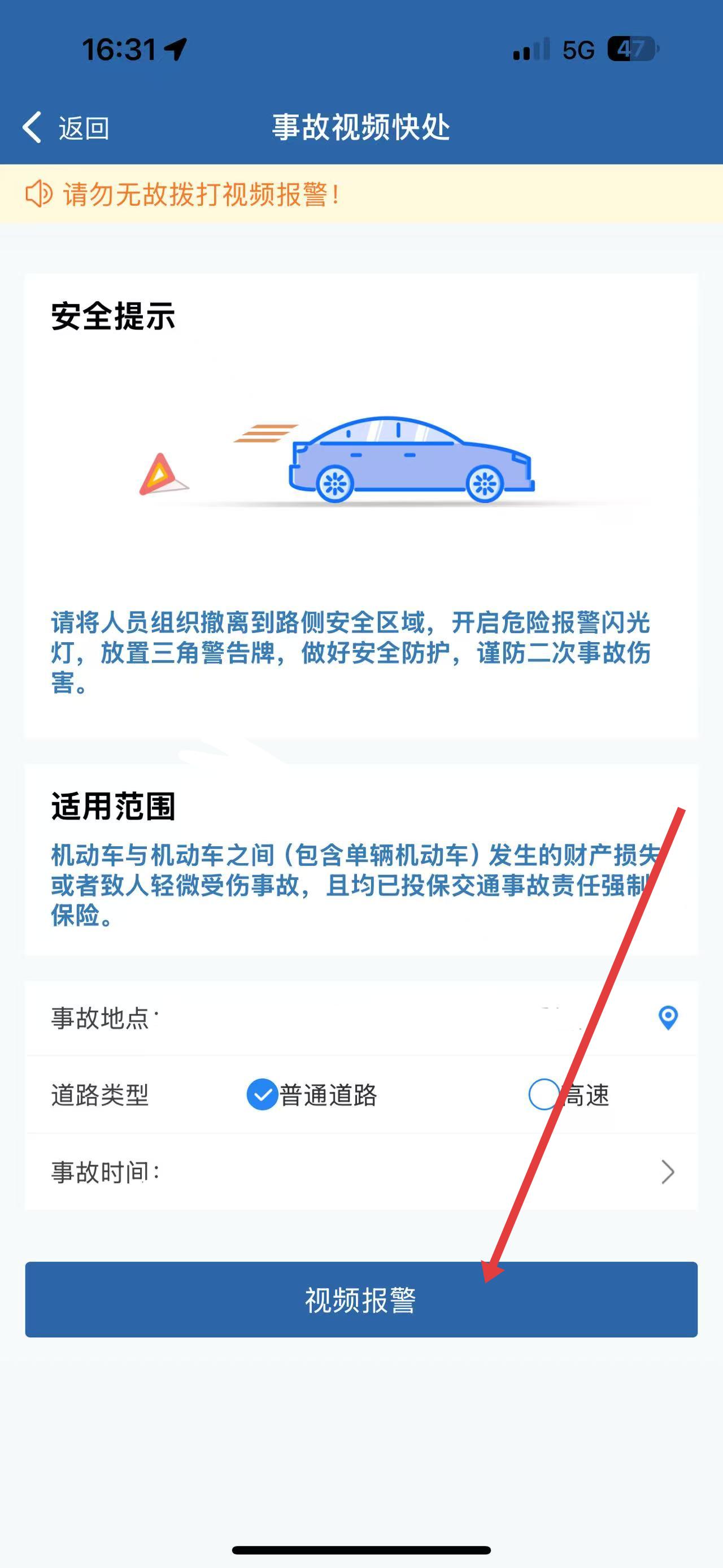 2、在事故視頻快處界面,閱讀安全提示和適用范圍后,填寫(xiě)事故地點(diǎn)、道路類(lèi)型等信息,再點(diǎn)擊視頻報(bào)警。