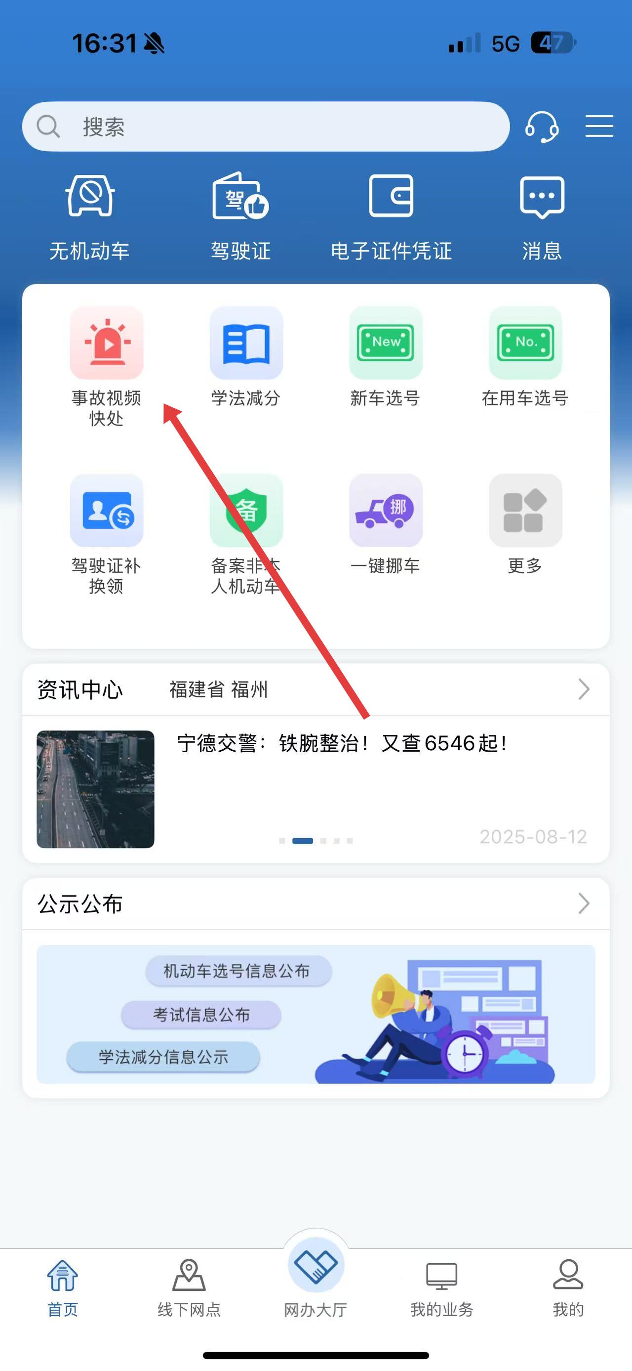 1、打開(kāi)交管12123APP進(jìn)入首頁(yè),點(diǎn)擊事故視頻快處選項(xiàng)進(jìn)入事故處理界面。