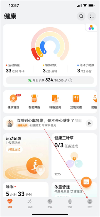 1、在華為運(yùn)動(dòng)健康的健康頁面,點(diǎn)擊底部設(shè)備選項(xiàng),進(jìn)入設(shè)備管理頁面。