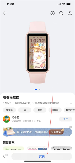 4、在表盤詳情頁中,點(diǎn)擊底部安裝,等待安裝完成即可更換表盤。