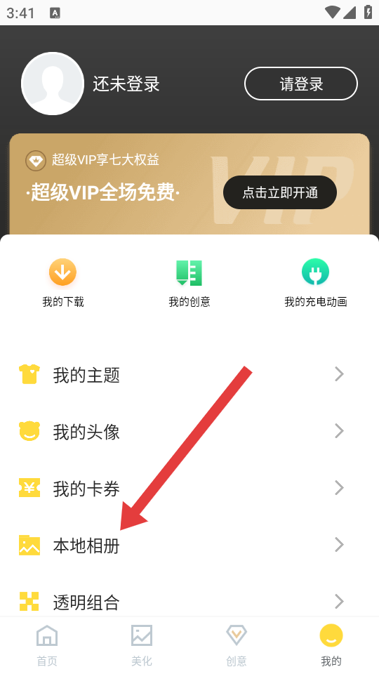 1、打開全局透明壁紙APP,進(jìn)入我的頁面,點(diǎn)擊本地相冊(cè)的選項(xiàng),進(jìn)入本地圖片選擇界面。