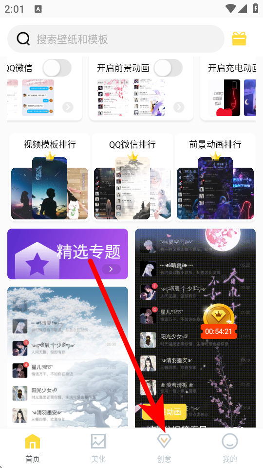 1、在全局透明壁紙首頁,點(diǎn)擊創(chuàng)意選項(xiàng),進(jìn)入創(chuàng)意頁面。