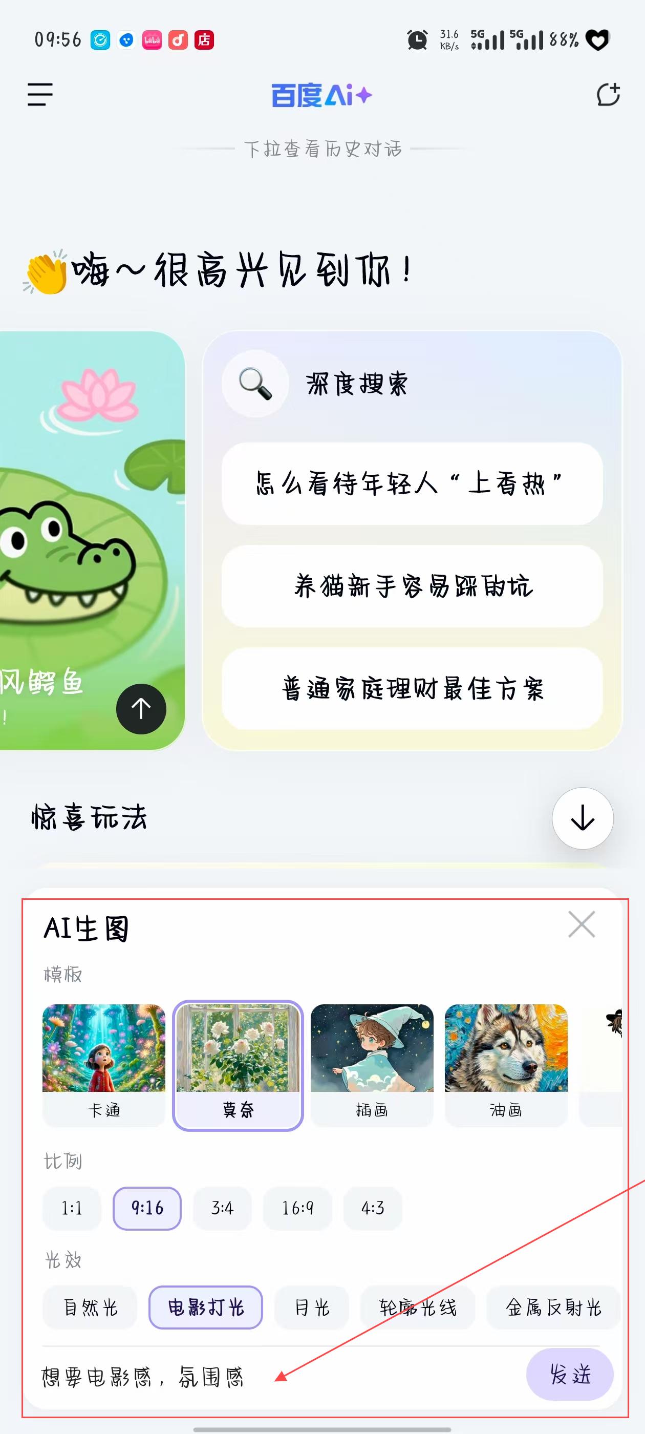 2、進(jìn)入AI生圖設(shè)置區(qū)域,選擇圖片模板,接著設(shè)置圖片比例,再選擇光效,像自然光、電影打光等,然后在輸入框中輸入對(duì)生成圖片的具體要求,完成后點(diǎn)擊發(fā)送。