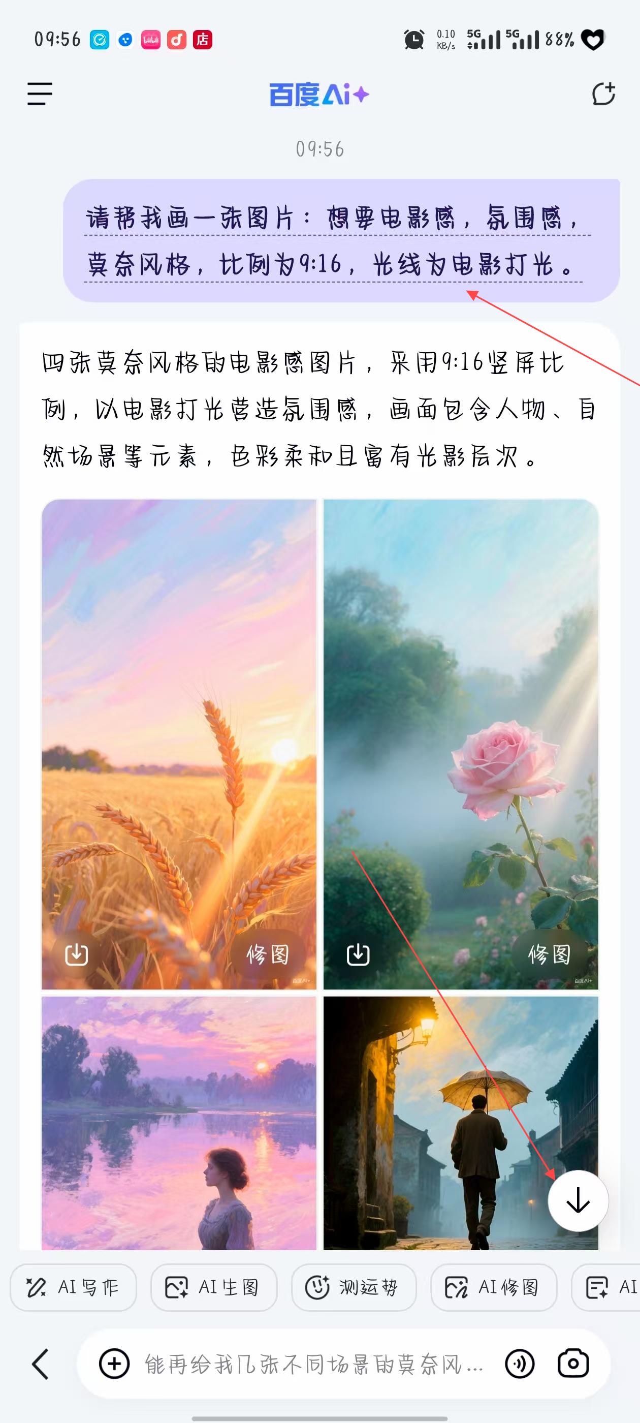 3、AI會(huì)根據(jù)設(shè)定的要求生成圖片,生成完成后,瀏覽生成的圖片,點(diǎn)擊圖片下方的下載圖標(biāo),即可將喜歡的圖片保存到手機(jī)。