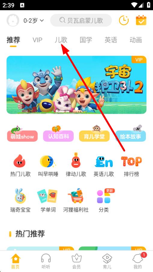 2、在首頁(yè)點(diǎn)擊上方兒歌欄目,進(jìn)入兒歌分類頁(yè)面。