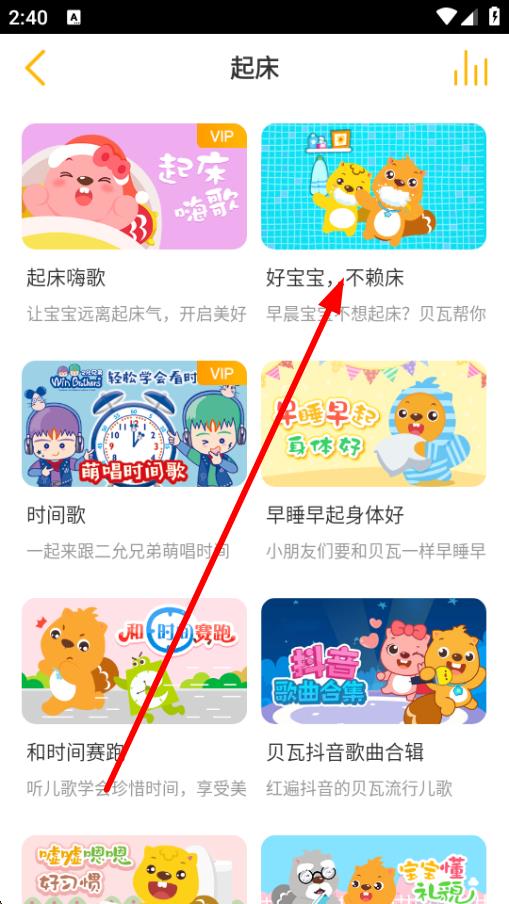 4、進(jìn)入起床類別頁(yè)面后,瀏覽并選擇想聽的兒歌,如點(diǎn)擊好寶寶,不賴床,即可播放兒歌。