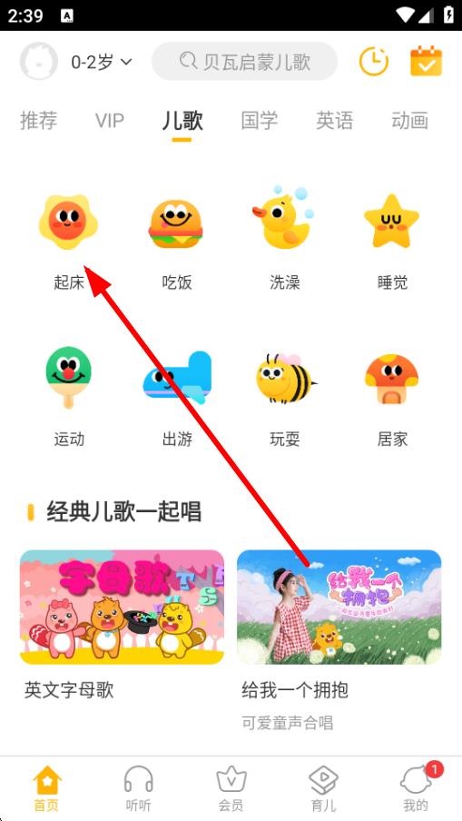 3、在兒歌分類頁(yè)面,根據(jù)不同場(chǎng)景選擇兒歌類別,如點(diǎn)擊起床。