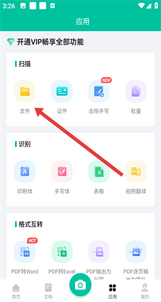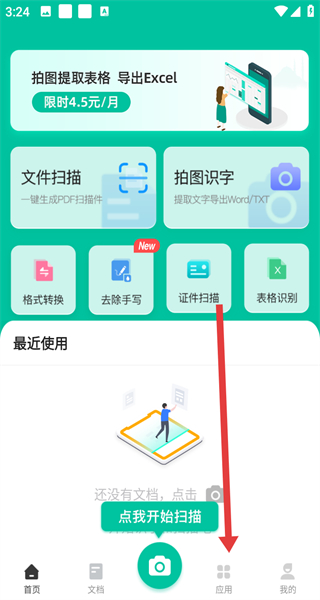 1、在掃描儀全能王APP首頁,點擊下方的應用選項,進入應用功能界面。