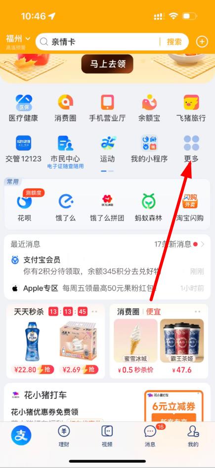 1、打開支付寶App,在首頁點擊更多選項,進入更多服務界面。