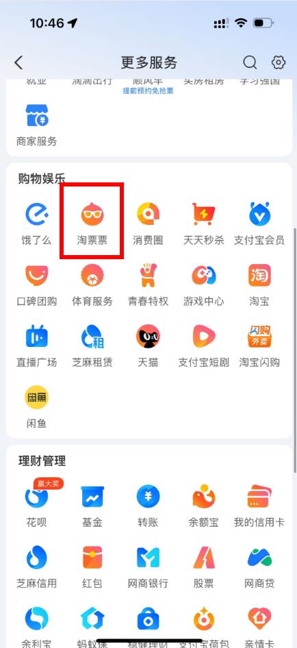 2、在更多服務界面的購物娛樂分類下,找到并點擊淘票票。