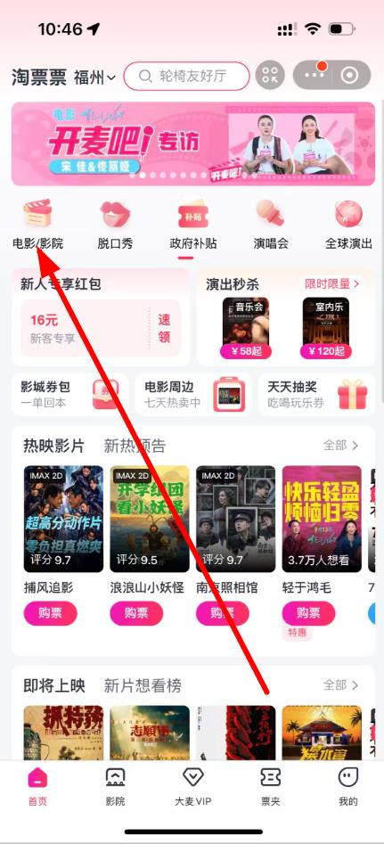 3、進入淘票票頁面后,點擊電影/劇院選項。