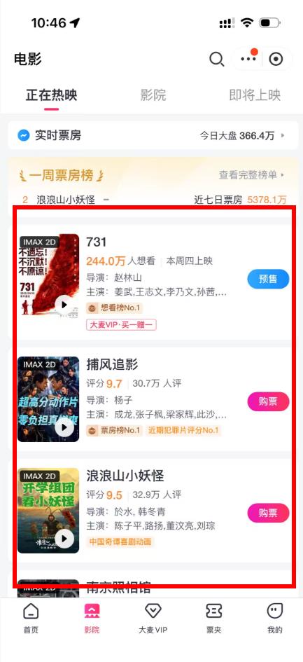 4、在電影界面中,查看正在熱映的影片,選擇想要觀看的電影,點擊其對應的購票按鈕即可。