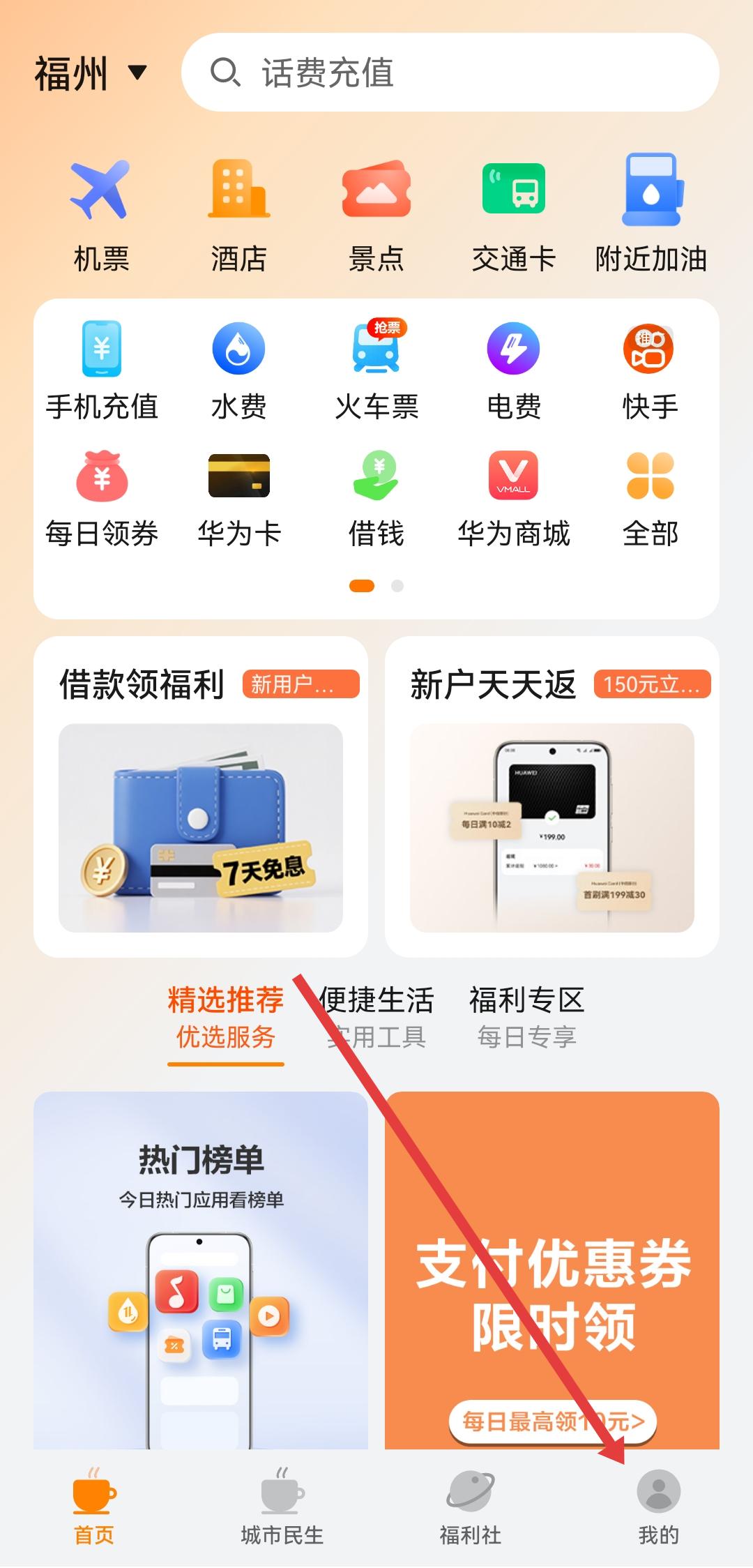 1、打開華為生活服務(wù)APP,點(diǎn)擊底部導(dǎo)航欄的我的,進(jìn)入個(gè)人中心頁面。