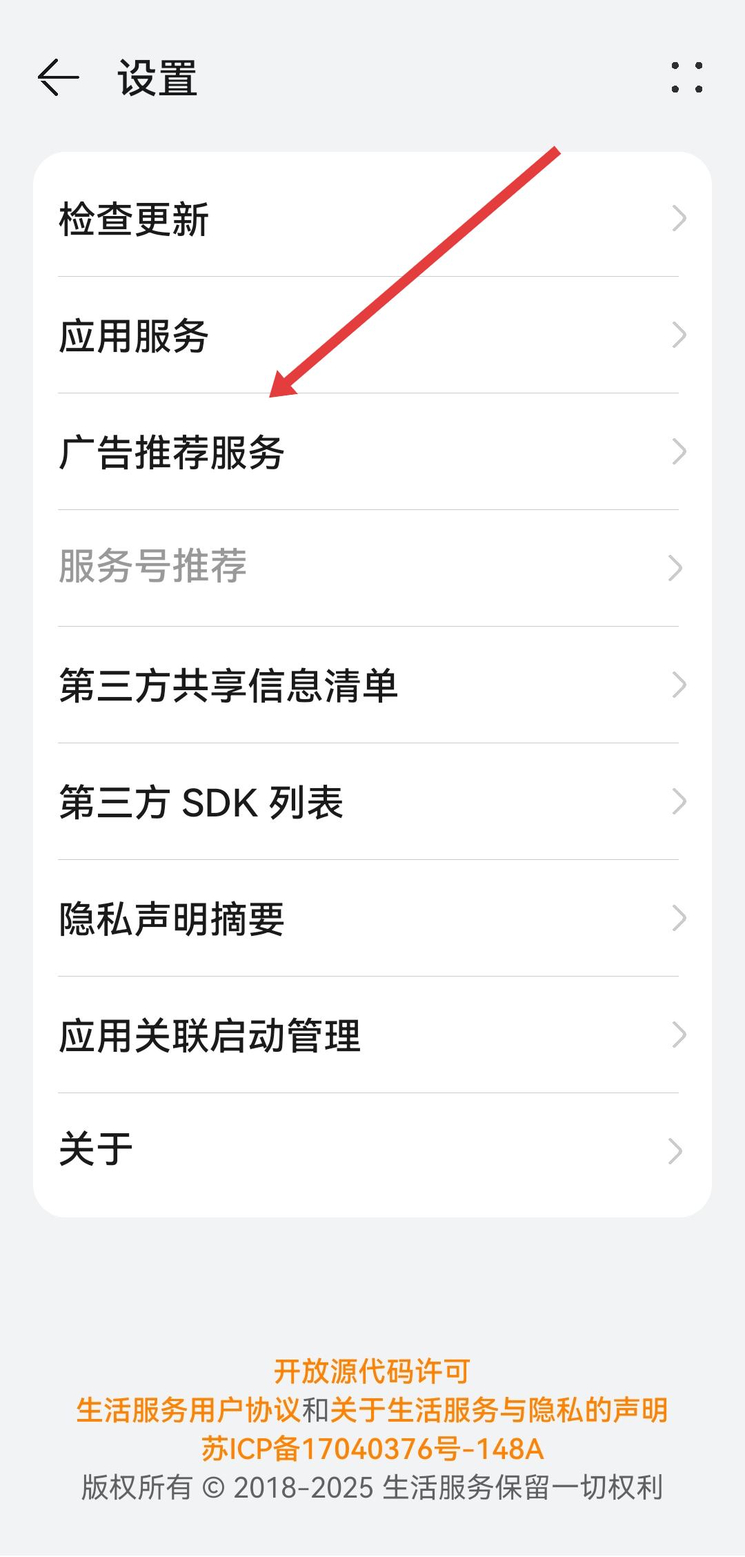 3、在設(shè)置的頁面,點(diǎn)擊廣告推薦服務(wù)的選項(xiàng),進(jìn)入廣告設(shè)置的頁面。