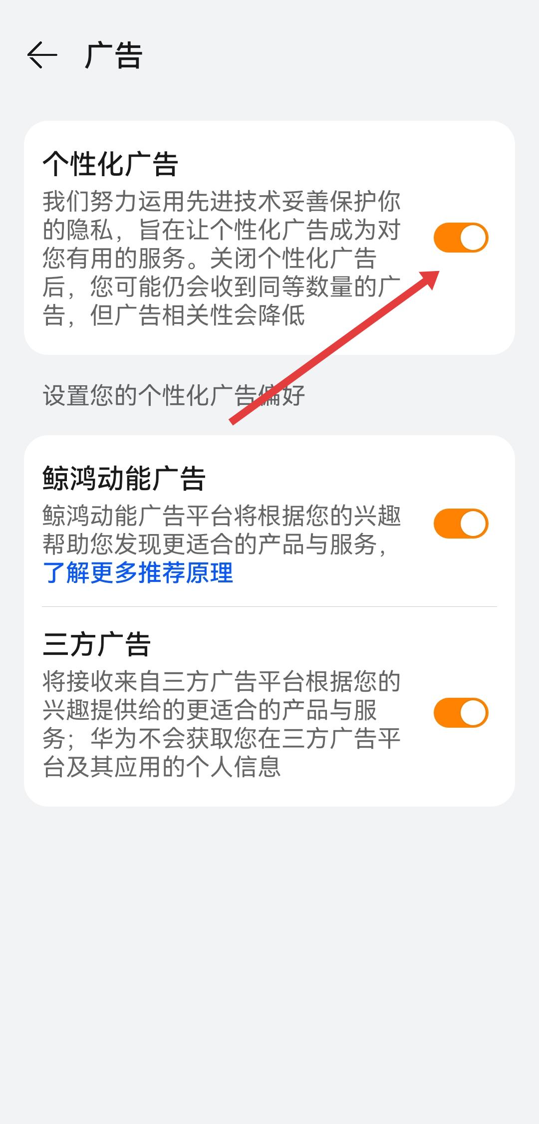 4、在廣告設(shè)置頁面,點(diǎn)擊個(gè)性化廣告的開關(guān),將其關(guān)閉即可減少個(gè)性化廣告推薦。
