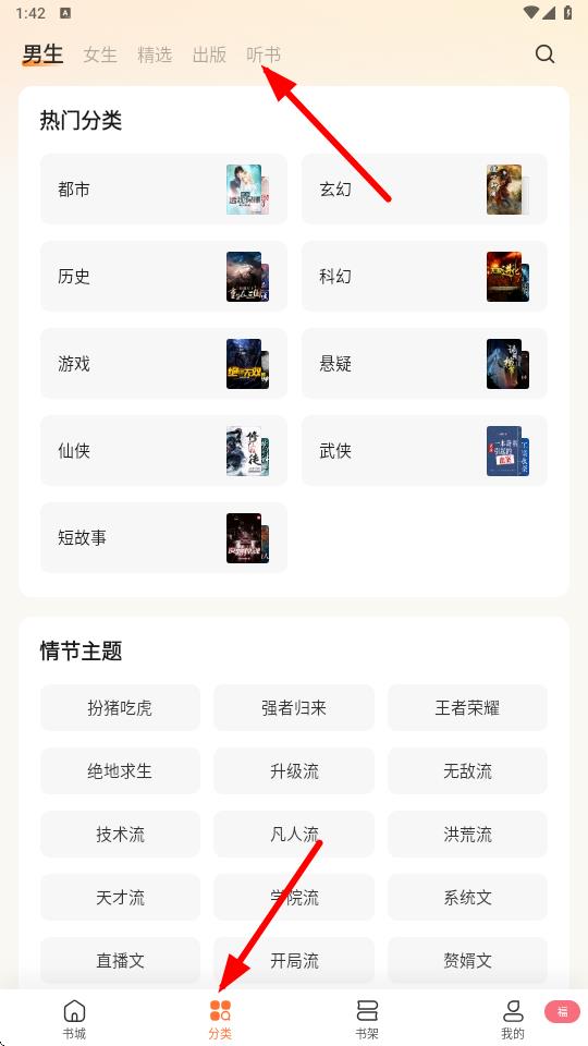1、打開多看閱讀App,點(diǎn)擊底部導(dǎo)航欄中的分類選項,然后點(diǎn)擊上方的聽書標(biāo)簽。