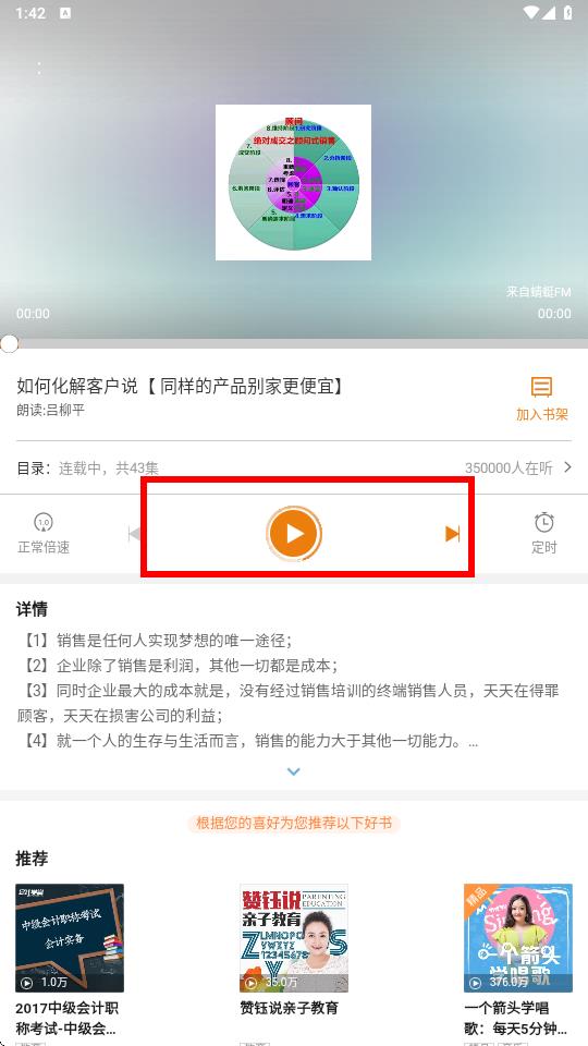 3、點(diǎn)擊進(jìn)入想聽的音頻詳情頁,點(diǎn)擊播放按鈕,即可開始收聽音頻內(nèi)容。