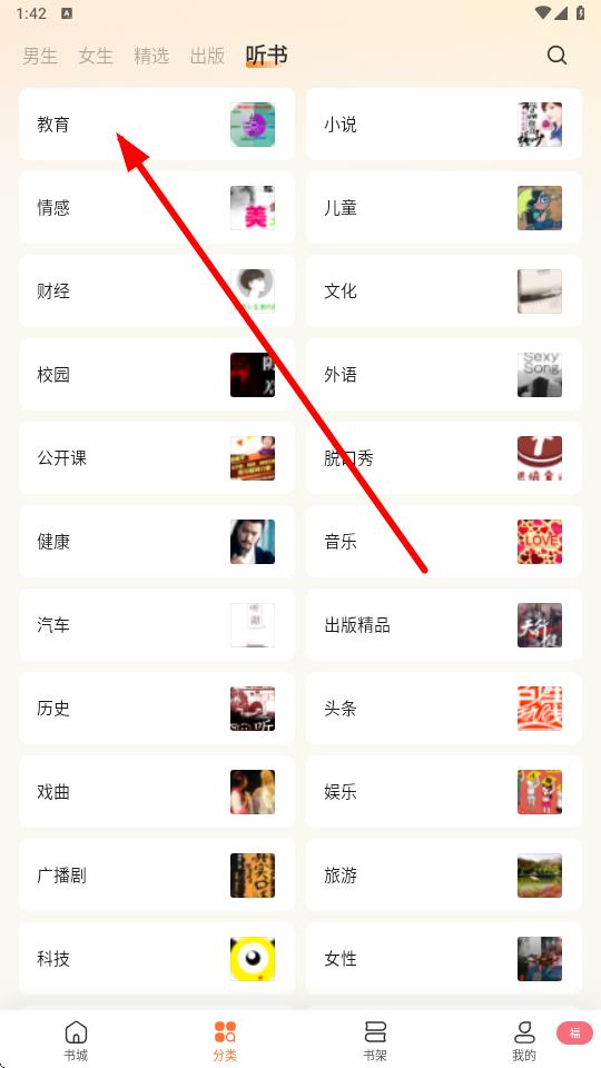 2、進(jìn)入聽書分類頁面后,瀏覽各類聽書內(nèi)容,比如選擇教育分類下想聽的書籍或音頻。
