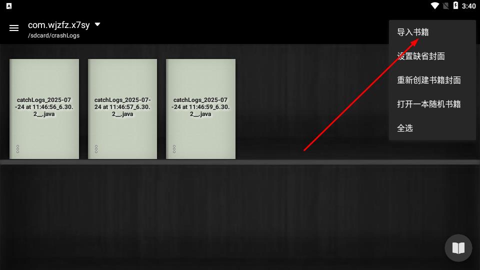 1、進(jìn)入文件管理界面,點(diǎn)擊右上角菜單的導(dǎo)入書籍選項(xiàng),啟動(dòng)本地書籍導(dǎo)入流程,擴(kuò)充閱讀資源。