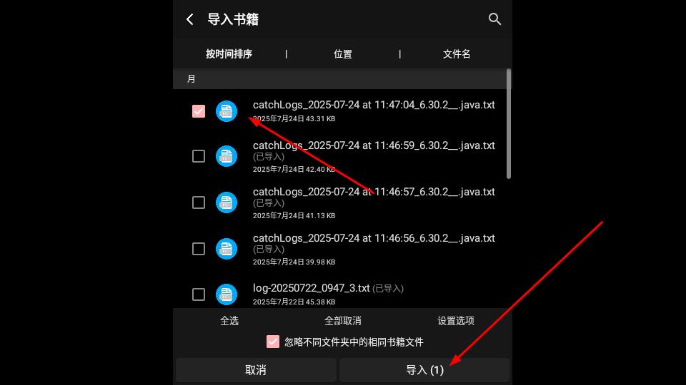 2、在導(dǎo)入界面勾選目標(biāo)文件如catchLogs格式,點(diǎn)擊底部導(dǎo)入按鈕,將文件添加至?xí)?,完成資源導(dǎo)入。