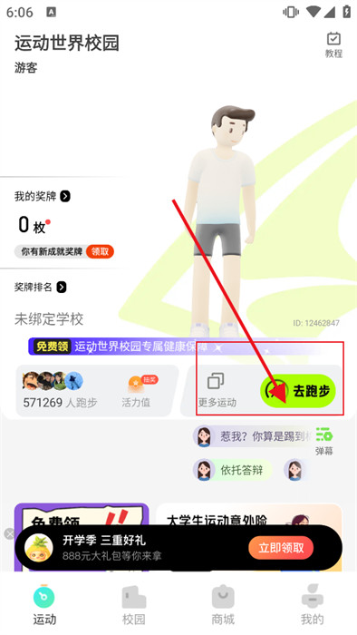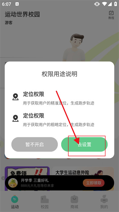 3、緊接著,點擊首頁中間【去跑步】,這樣會自動跳轉(zhuǎn)到權(quán)限開啟頁面;