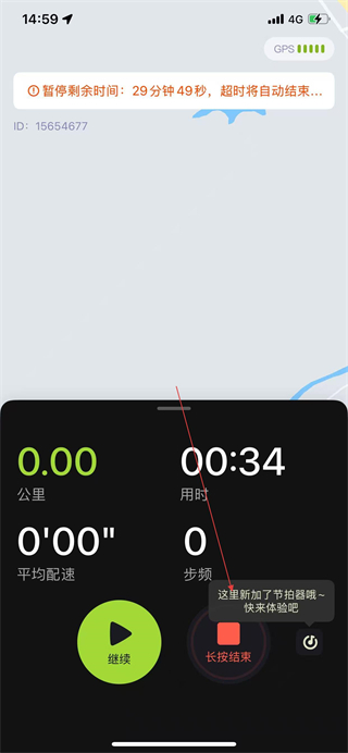 3、在暫停后的頁面中,點擊長按結(jié)束,完成當前運動的結(jié)束操作。