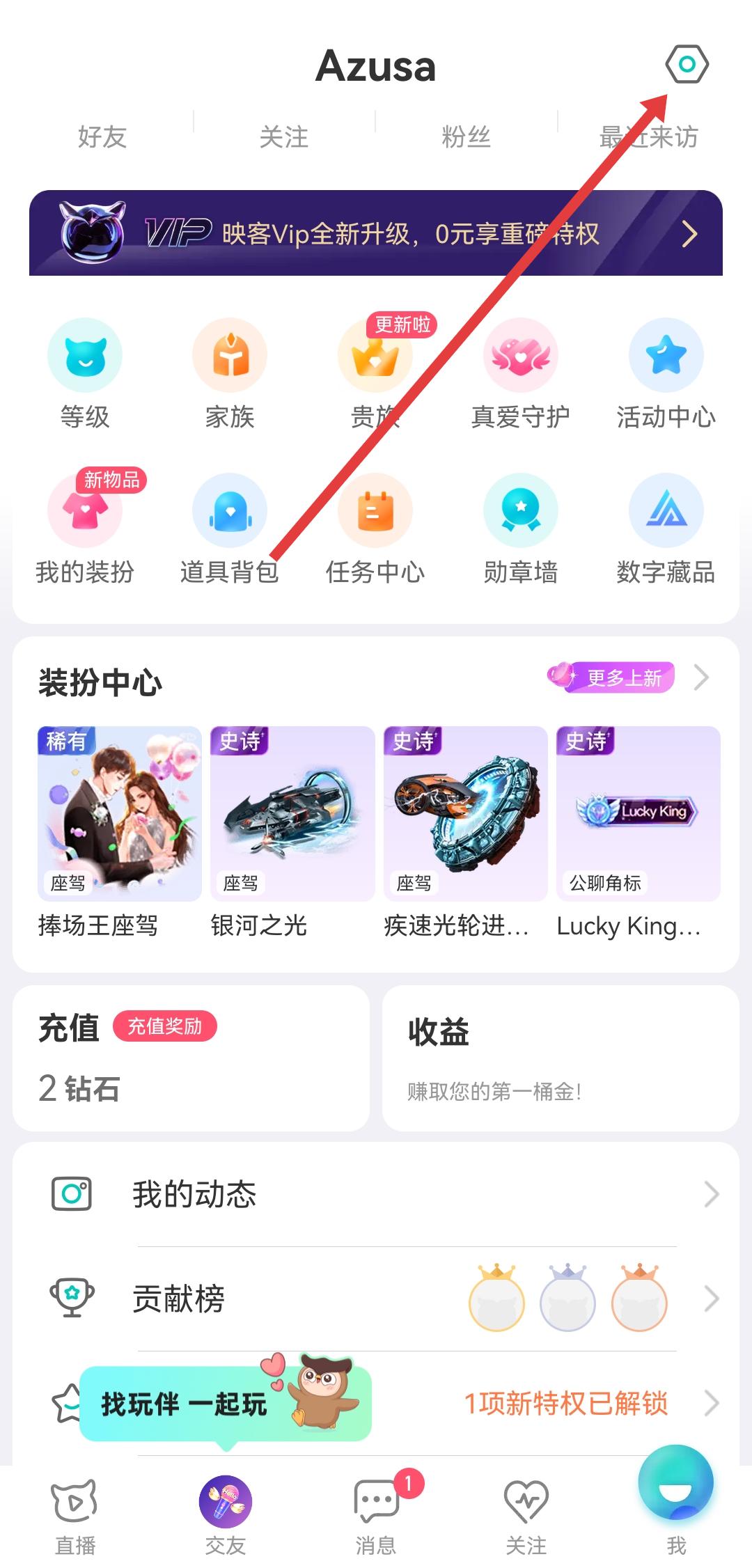 1、打開映客直播APP,進(jìn)入我的個人頁面,點(diǎn)擊右上角的設(shè)置圖標(biāo),進(jìn)入設(shè)置界面。