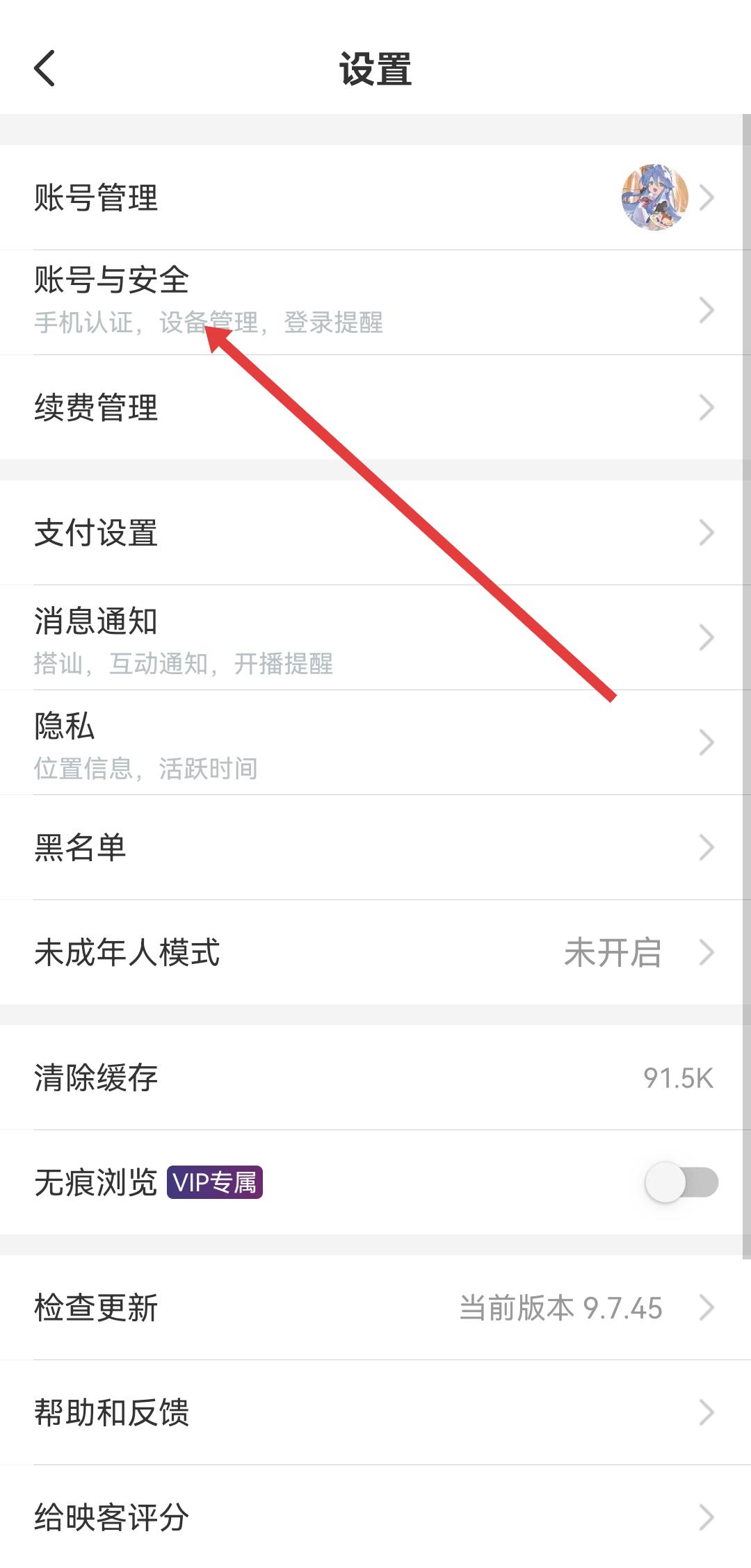 2、在設(shè)置頁面中,找到賬號與安全選項并點(diǎn)擊,進(jìn)入賬號安全相關(guān)設(shè)置頁面。