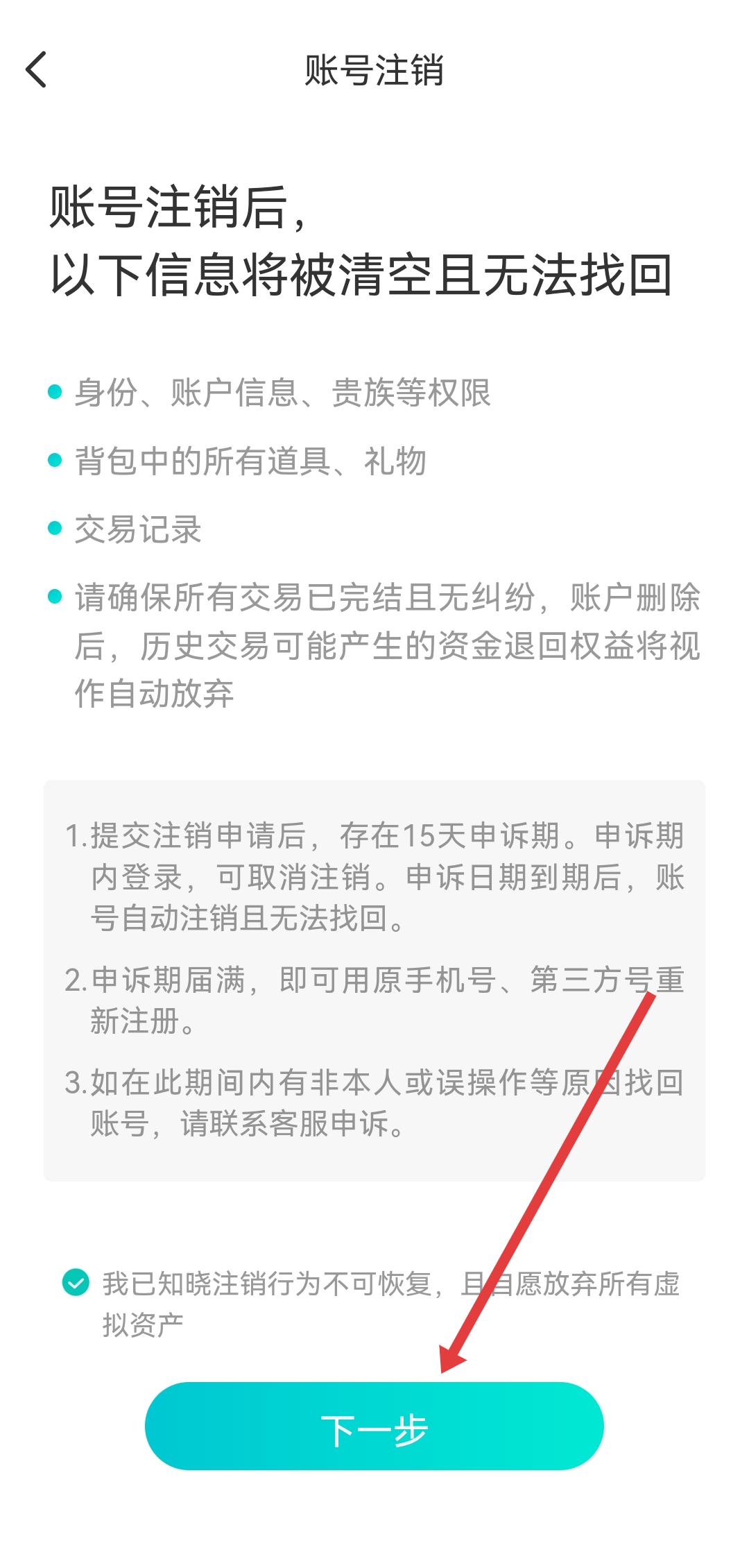 4、在賬號注銷頁面,勾選我已知曉等注意事項,然后點(diǎn)擊下一步,按指引完成后續(xù)注銷操作。