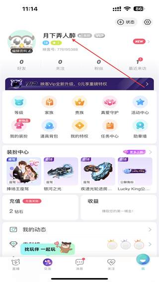 2、在我的頁面內(nèi),點(diǎn)擊用戶昵稱的區(qū)域位置。