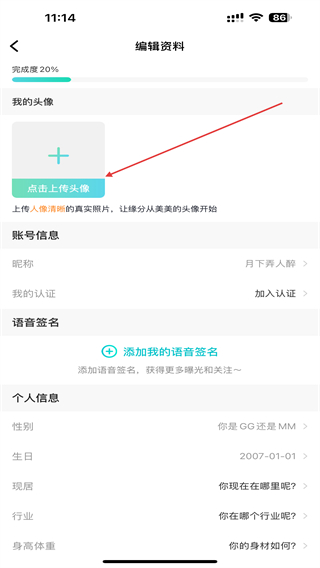 4、在編輯資料的頁面內(nèi),點(diǎn)擊上傳頭像的按鈕即可。