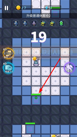 2、點擊下方帶綠色箭頭的區(qū)域,積攢金幣后可升級建筑,鐵門升級可提升血量,增強防御能力。