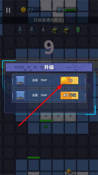 3、當(dāng)金幣足夠時,點擊建筑彈出升級選項,消耗金幣可升級鐵門,提升其血量,增強防御抵御敵人進(jìn)攻。