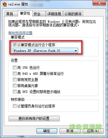 Windows 7系統(tǒng)在運(yùn)行本游戲時(shí)存在兼容問題,部分玩家通過桌面快捷方式,可能無法正常啟動游戲。此時(shí)請玩家直接前往游戲安裝文件夾下,選擇Ra2.exe,右鍵點(diǎn)擊,屬性,選擇兼容性,勾選以Windows XP(service pack3)兼容模式運(yùn)行這個(gè)程序,