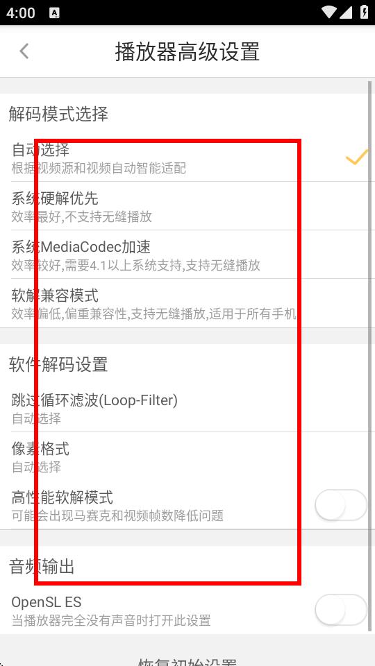 4、在播放器高級設(shè)置頁面,可對解碼模式、軟件解碼設(shè)置、音頻輸出等進行設(shè)置,根據(jù)需求選擇合適的選項即可完成播放器設(shè)置修改。