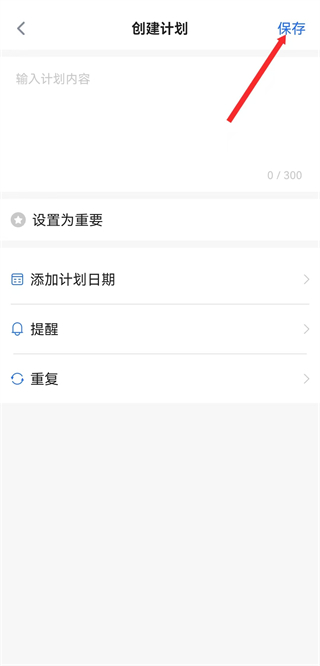 3、在創(chuàng)建計(jì)劃頁(yè)面,輸入計(jì)劃內(nèi)容等選項(xiàng),完成后點(diǎn)擊保存。