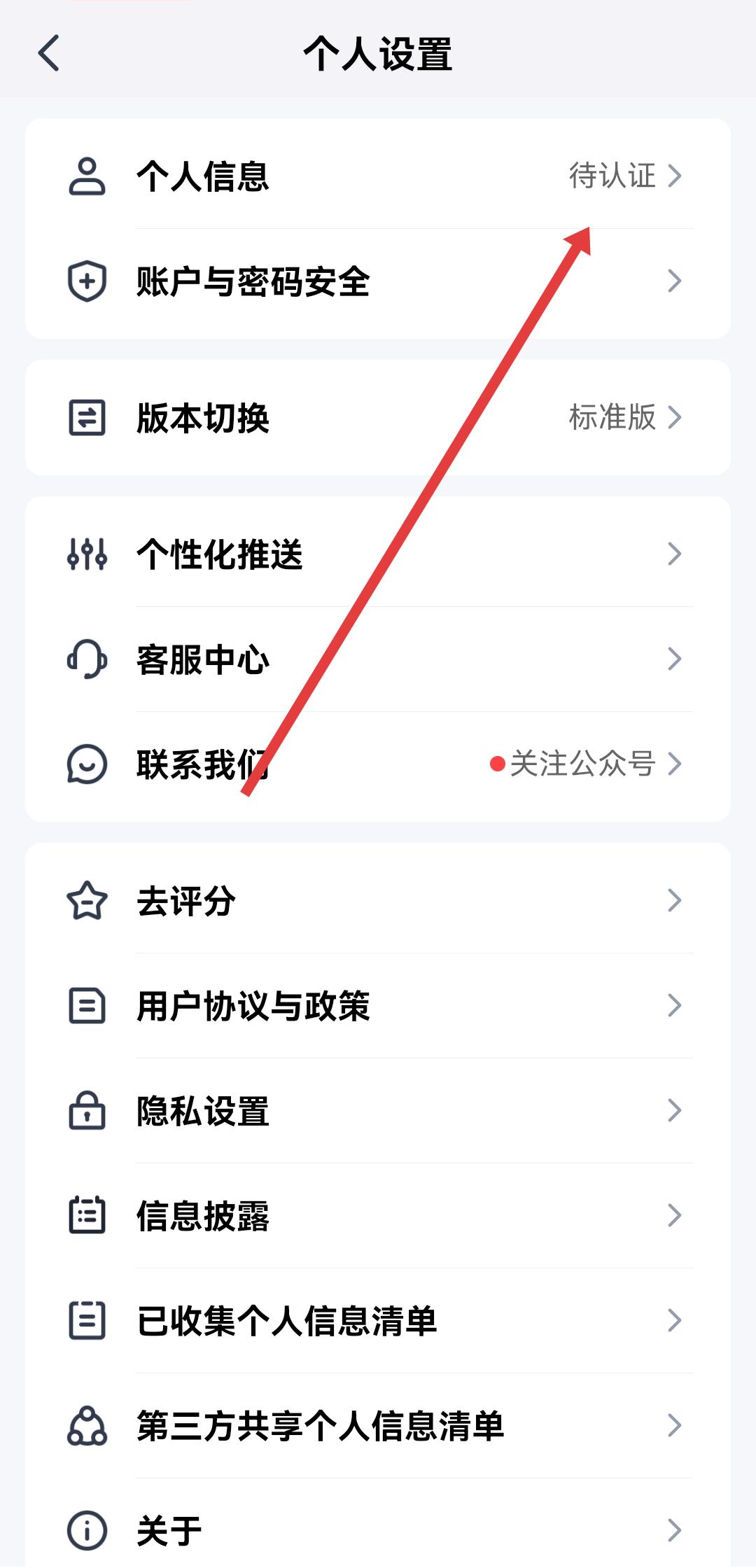 1、進(jìn)入平安金管家APP的個(gè)人設(shè)置頁(yè)面,點(diǎn)擊個(gè)人信息選項(xiàng)右側(cè)顯示待認(rèn)證,進(jìn)入個(gè)人信息的界面。