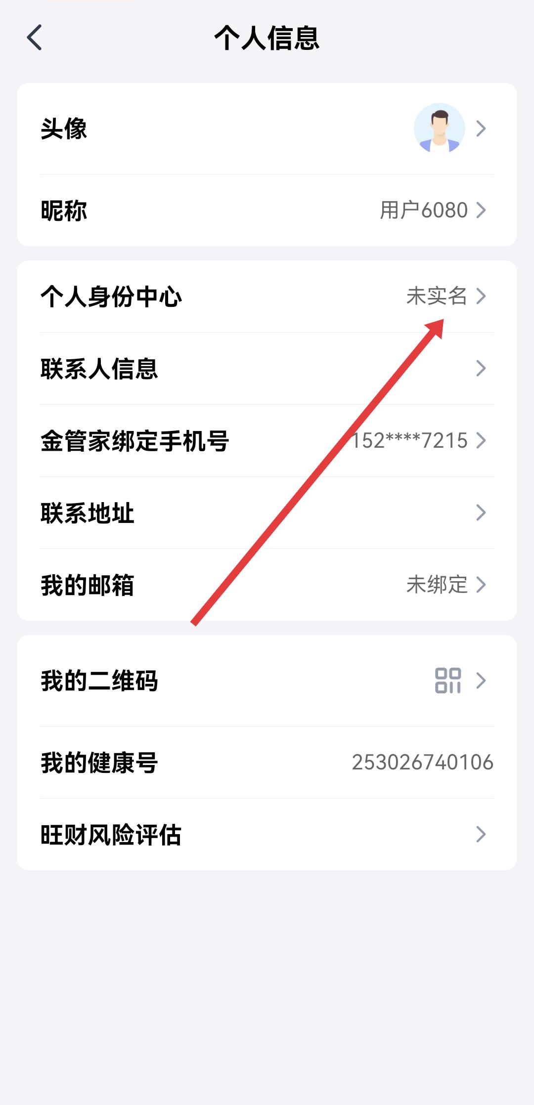 2、在個(gè)人信息的頁(yè)面,點(diǎn)擊個(gè)人身份中心選項(xiàng),右側(cè)顯示未實(shí)名,會(huì)觸發(fā)未實(shí)名提醒的彈窗。