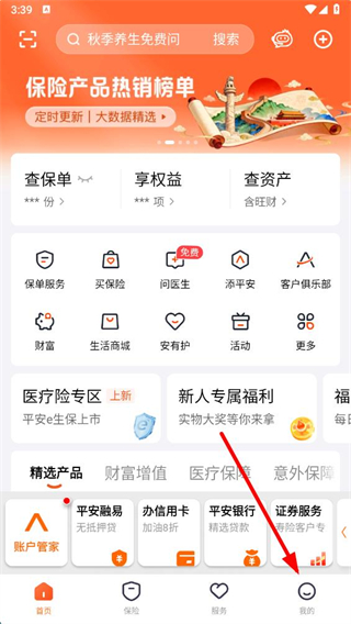 1、打開(kāi)平安金管家app,點(diǎn)擊底部導(dǎo)航欄中的我的選項(xiàng)。