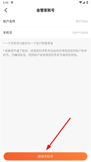 4、在金管家賬號(hào)頁(yè)面,點(diǎn)擊修改手機(jī)號(hào)按鈕,按照提示完成手機(jī)號(hào)修改操作。
