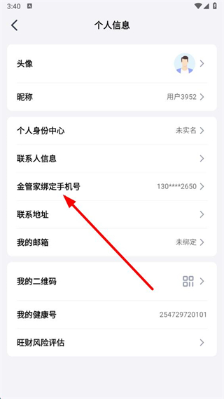 3、在個(gè)人信息頁(yè)面,點(diǎn)擊金管家綁定手機(jī)號(hào)選項(xiàng),進(jìn)入金管家賬號(hào)頁(yè)面。