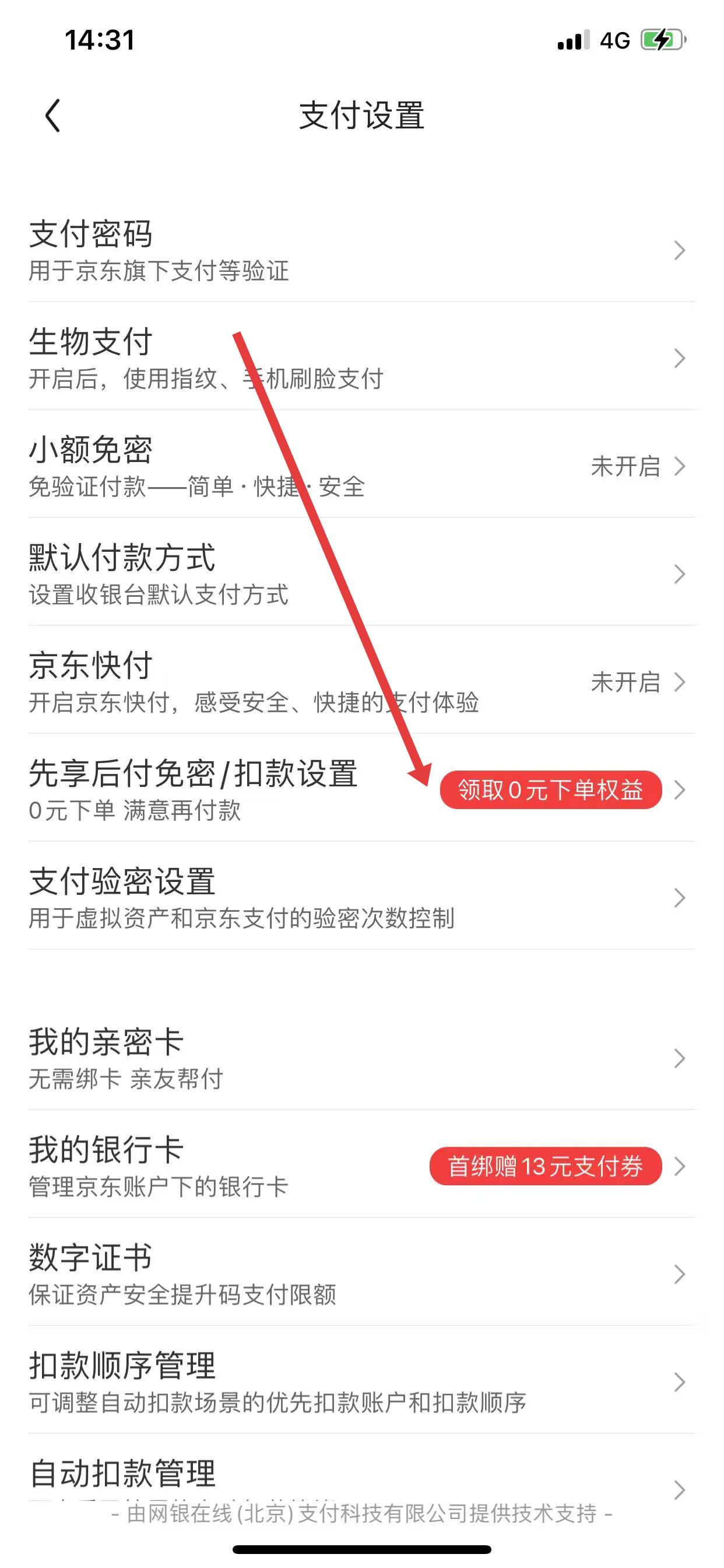 2、進入后,選擇先享后付免密/扣款設置,點擊右側領取0元下單權益。