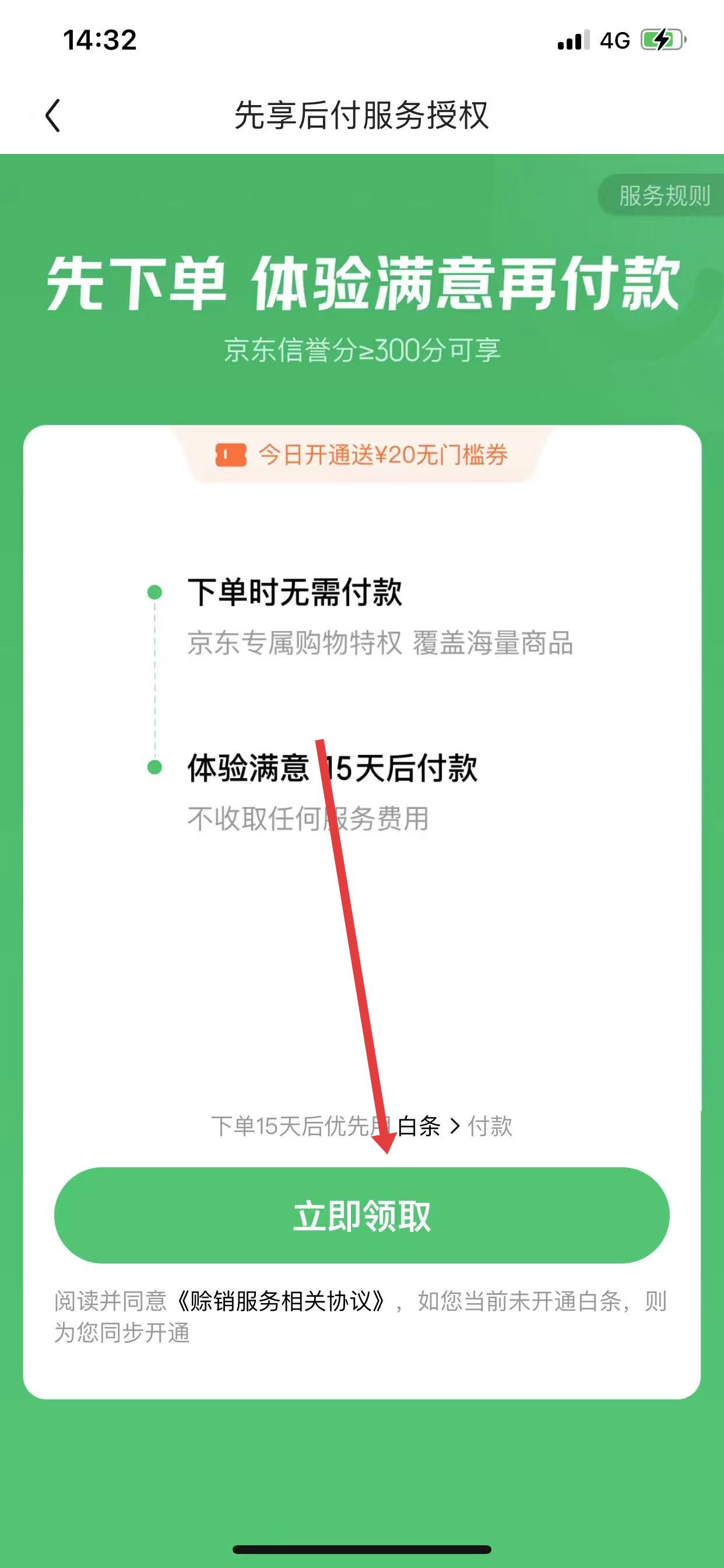 3、跳轉至先享后付服務授權頁,閱讀并同意協(xié)議,點擊立即領取,完成開通。