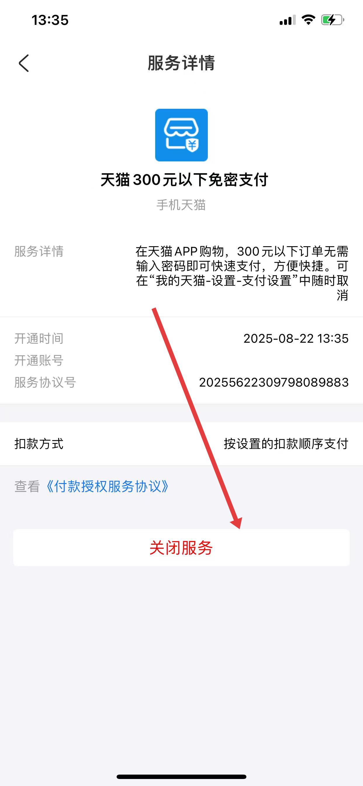 3、,進入小額免密支付的服務詳情頁,點擊關閉服務,按照提示確認關閉即可。